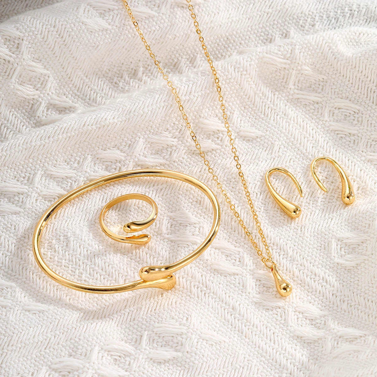 En gros à partir de 5 Pcs Ensemble de Bijoux Femme Tendance en Plaqué Or et Argent Goutte d'Eau 4 Pièces : Collier, Boucles d'Oreilles, Bagues Torsadées et Bracelet Jonc