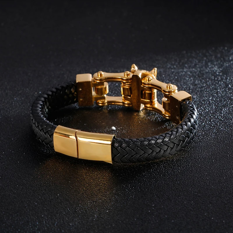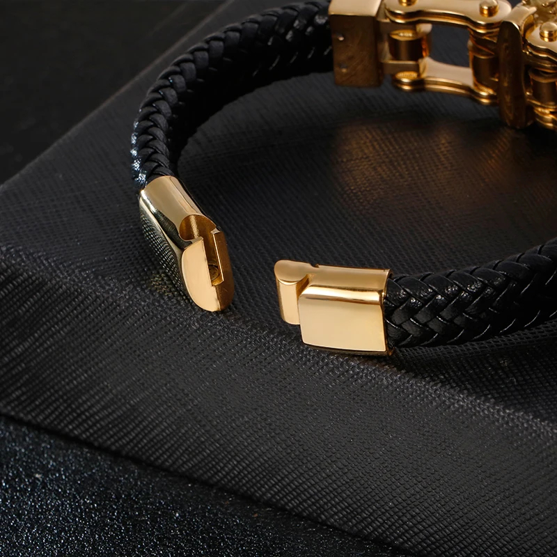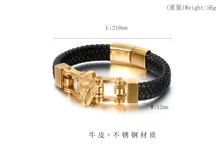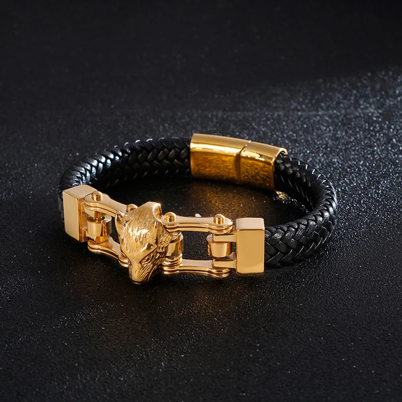 KALEN Bracelet homme loup en acier inoxydable noir et cuir véritable tressé doré
