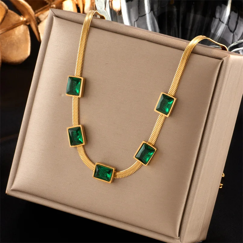 Parure de Bijoux Délicate pour Femme Comprenant Collier à Pendentifs Superposés Cœur et Œil en Zircon Émeraude, Boucles d'Oreilles et Bracelet en Acier Inoxydable Plaqué Or 18 Carats