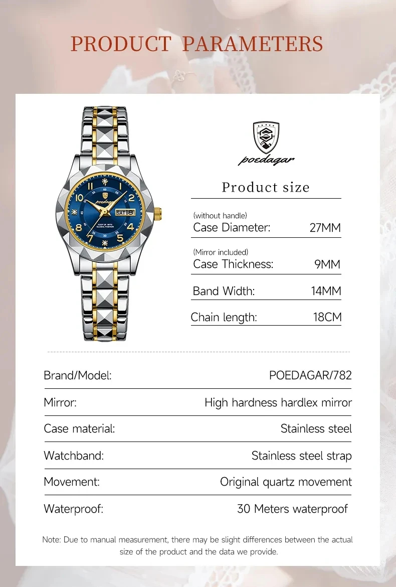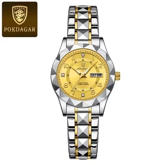 POEDAGAR 782 Montre habillée pour femme Montre-bracelet lumineuse étanche à la semaine Date pour femme Montre-bracelet en acier inoxydable pour femme Montre à quartz pour cadeau