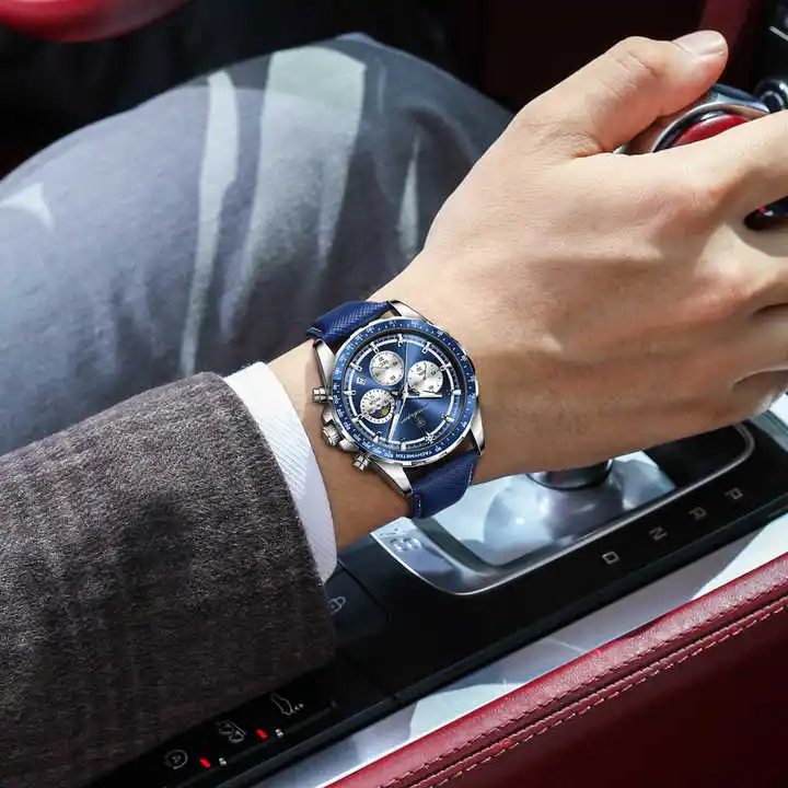 POEDAGAR 879 Montre décontractée à la mode à bracelet en cuir véritable bleu Montre à quartz étanche à mains lumineuses Sport Montre-bracelet pour hommes